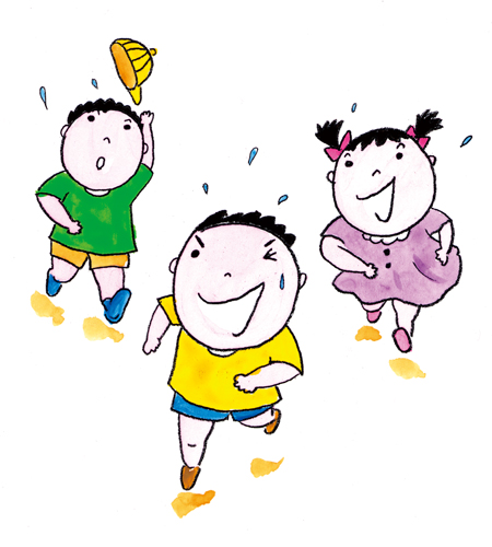 かけっこしたらあせをいっぱいかいちゃった。あせをかいたらよくふいて、水分をとることも忘れずに。お友だちと元気に遊びましょう。